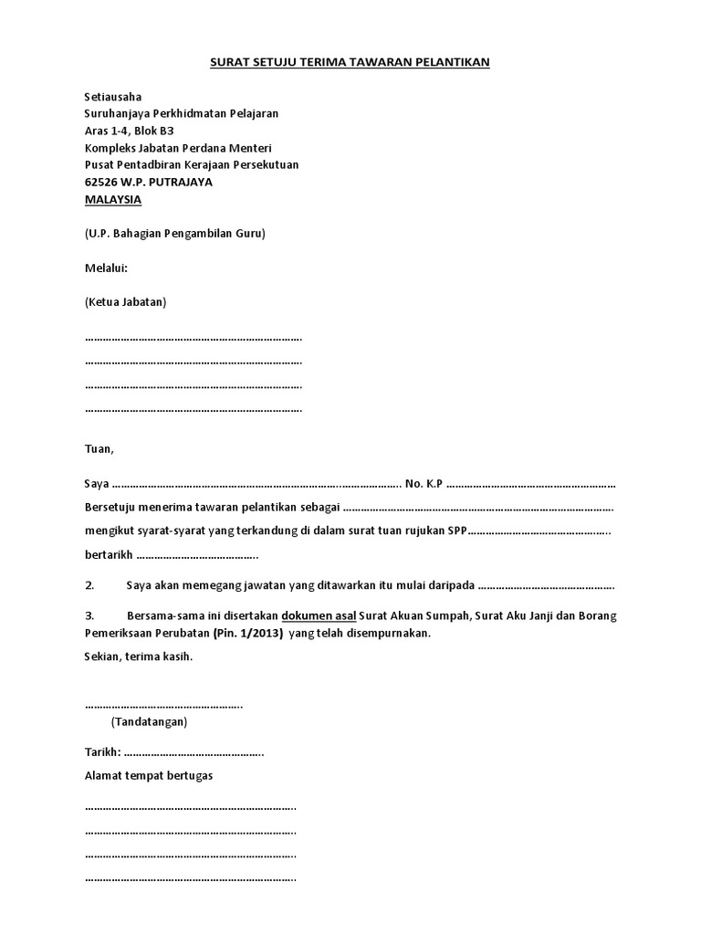 Surat Setuju Terima Pelantikan. Surat Aku Janji Muat Turun. SURAT SETUJU-TERIMA TAWARAN PELANTIKAN Setiausaha Suruhanjaya Perkhidmatan Pelajaran Aras 1-4 Blok B3 Kompleks Jabatan Perdana Menteri Pusat Pentadbiran Kerajaan Persekutuan 62526 WP PUTRAJAYA MALAYSIA.